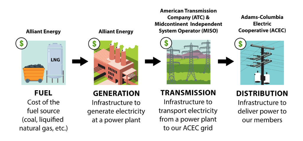 We purchase power from Alliant Energy and utilize transmission lines to deliver that power to distribution system to ultimately deliver power to our members’ homes and businesses. The image below shows a breakdown of the organizations we partner with and the costs we incur to deliver power.
